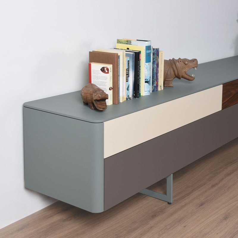 Het bovenblad van de TAPA loopt in verstek door in de bovenste frontstrook en vormt daardoor een soort deksel op het lowboard. Naar wens kan steeds de bovenste frontstrook als lade worden gekozen.