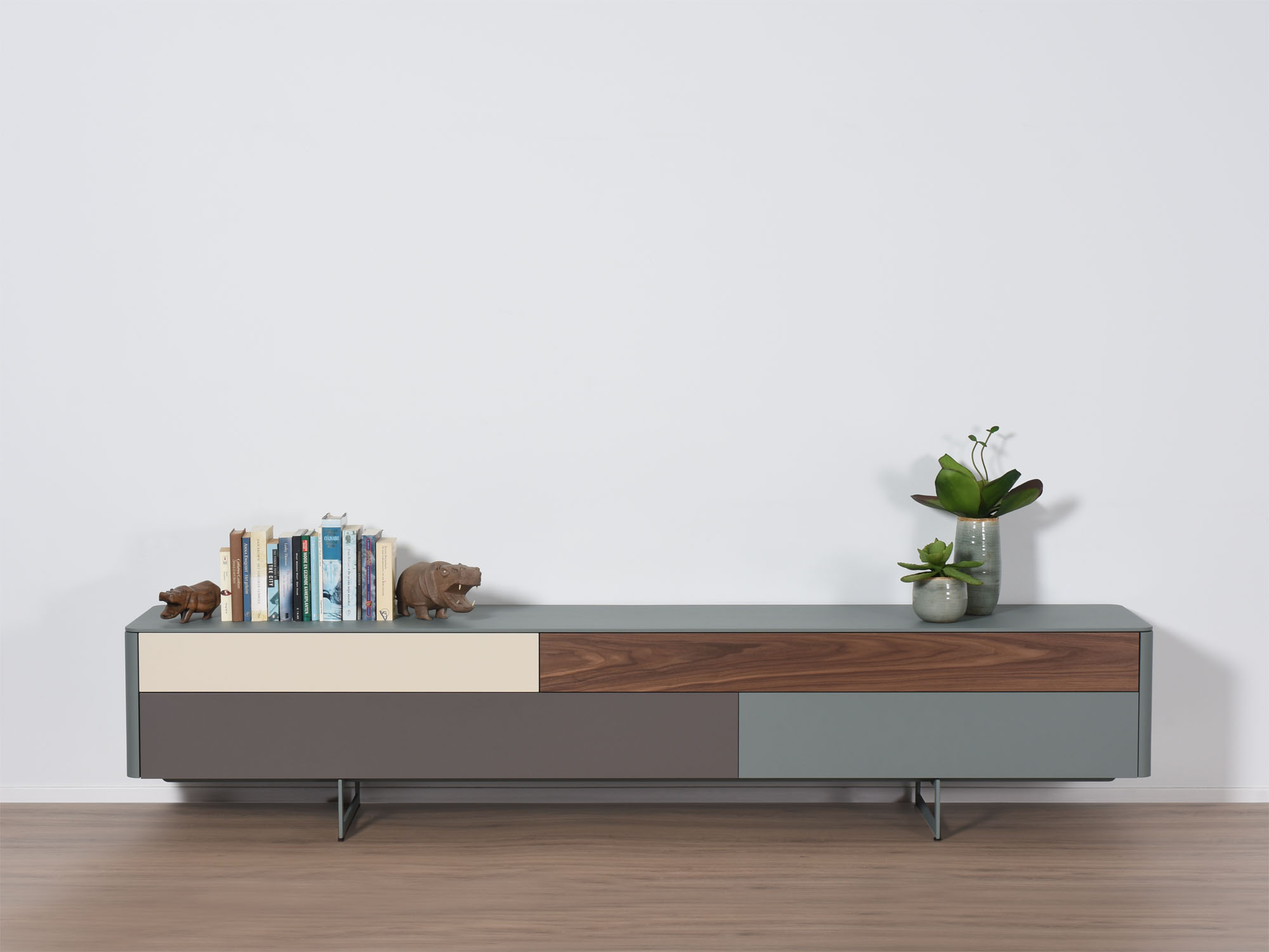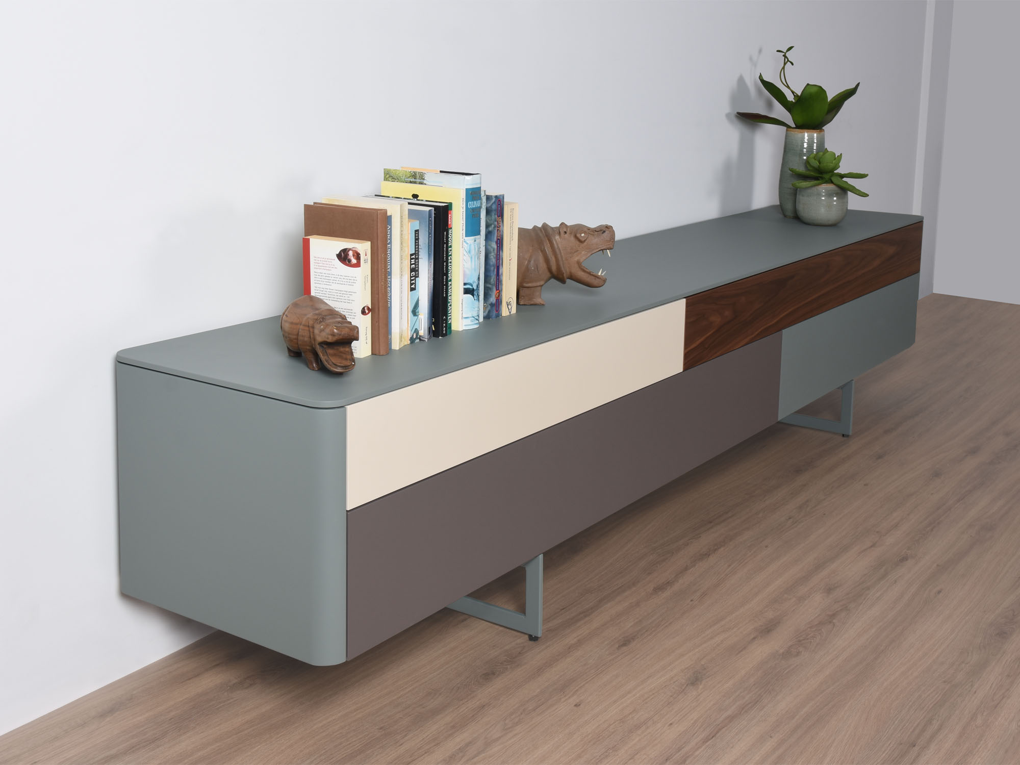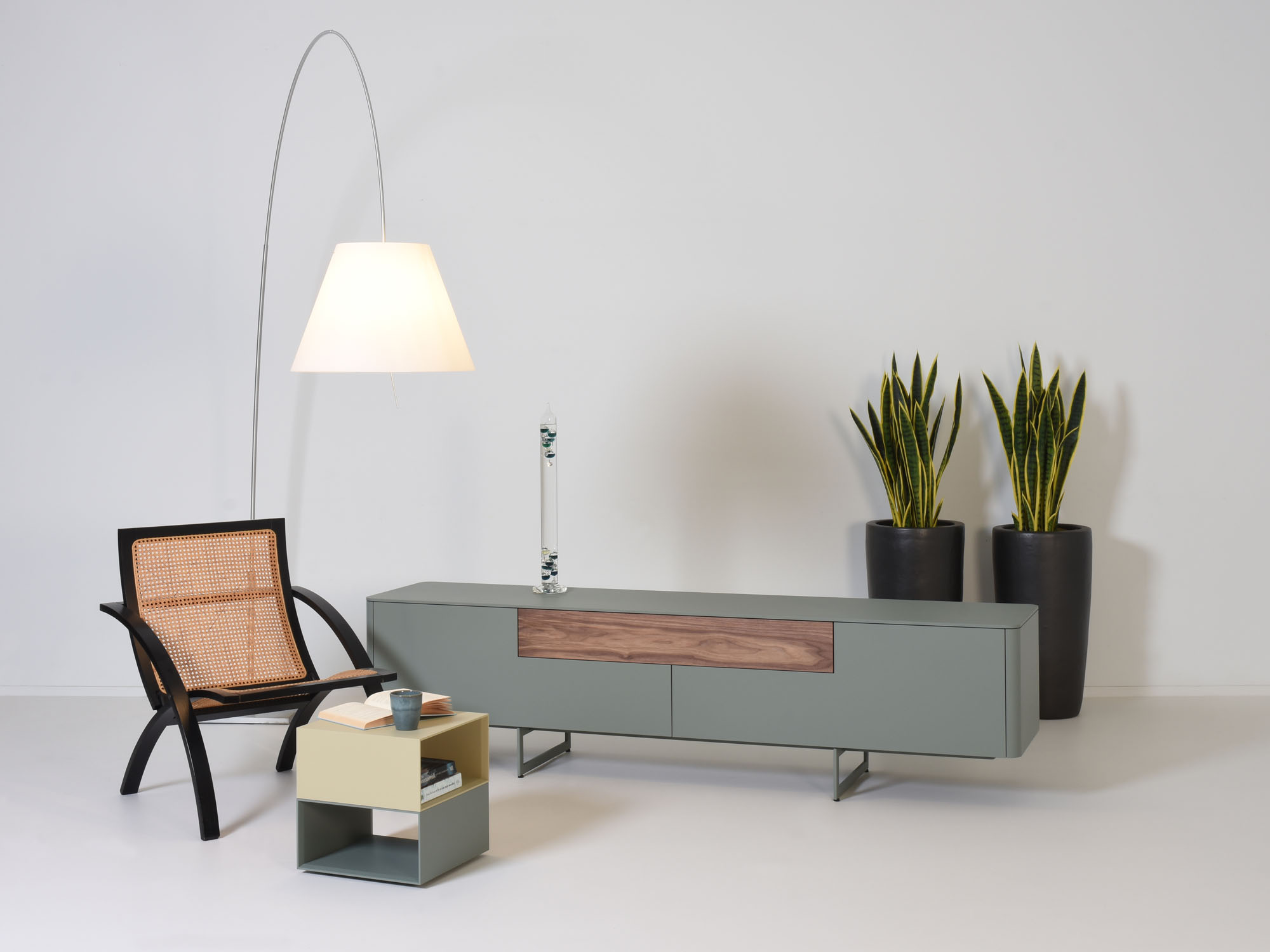 U kunt uw individuele lowboard samenstellen door de open rompen in te vullen met een passende mix van fronten als kleppen, laden en nissen. Bovendien kunt u door het toevoegen van diverse ventilatie- en bekabelingsgaten, draaibare TV-paal en speakerdoek van dat lowboard uw ideale apparatuurkast maken.